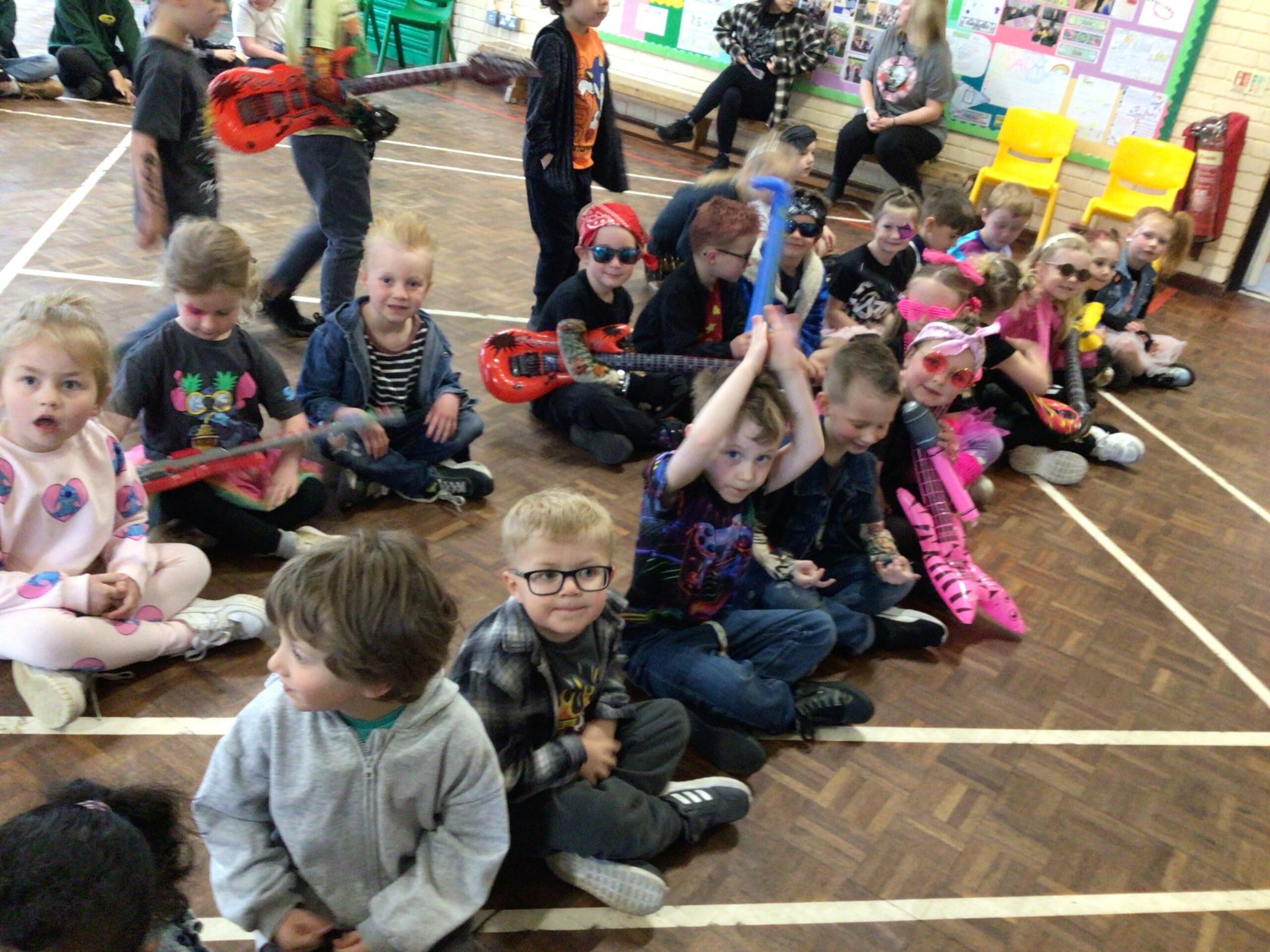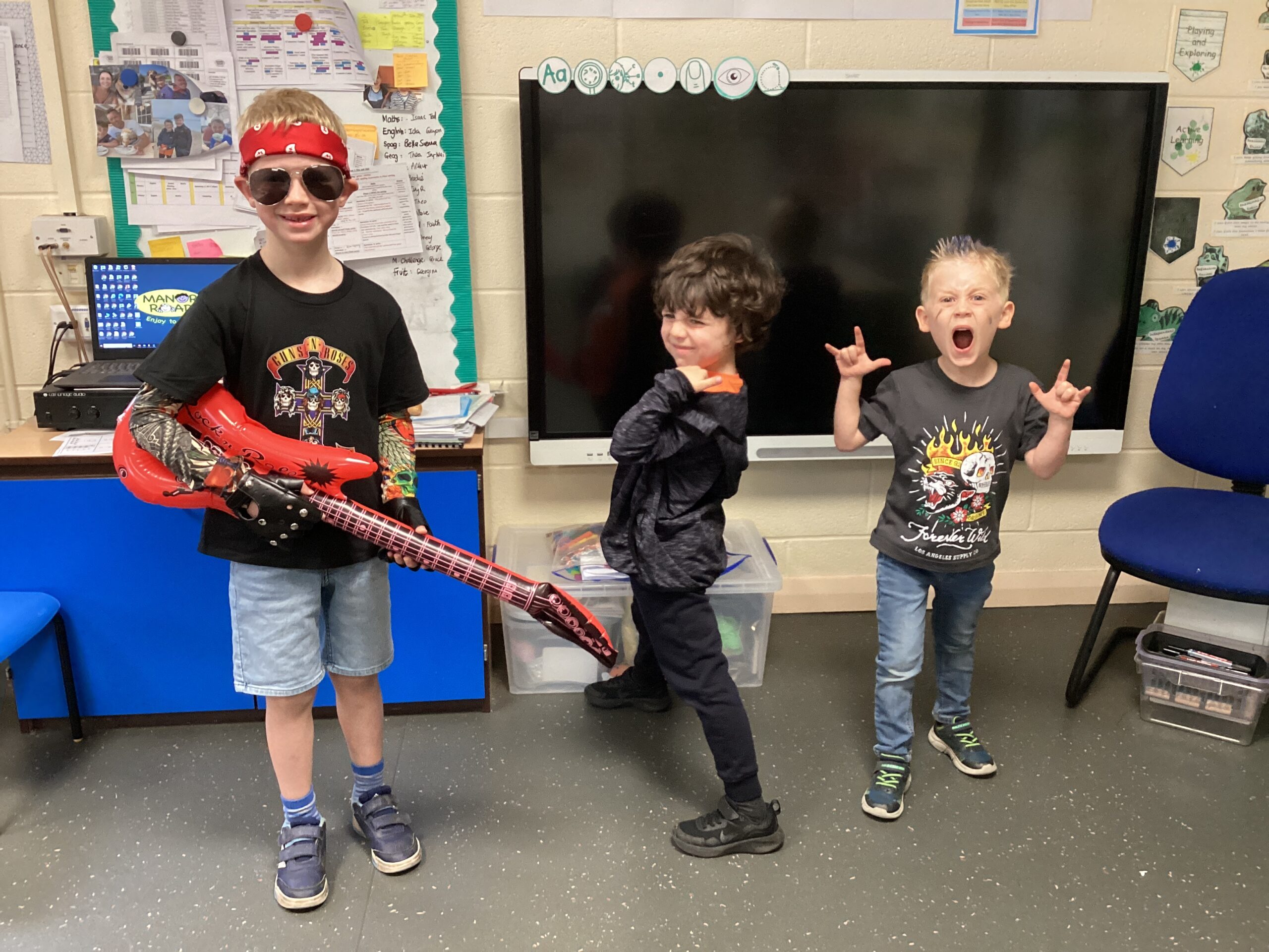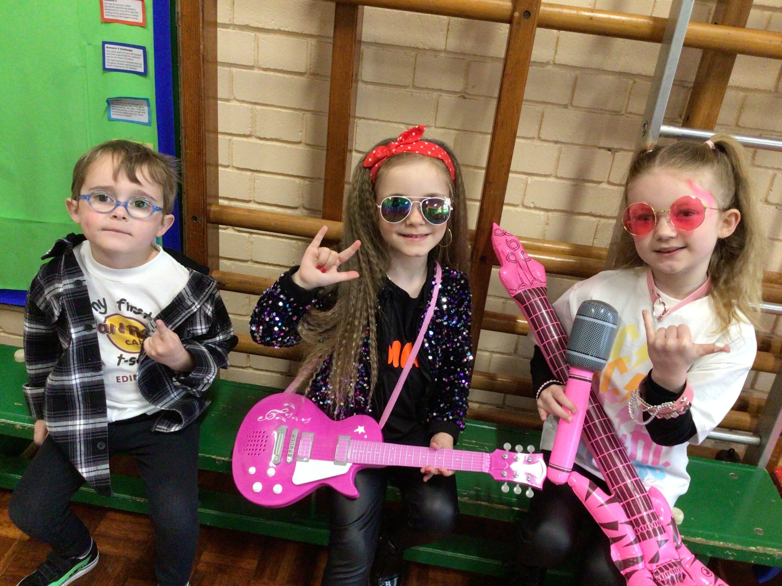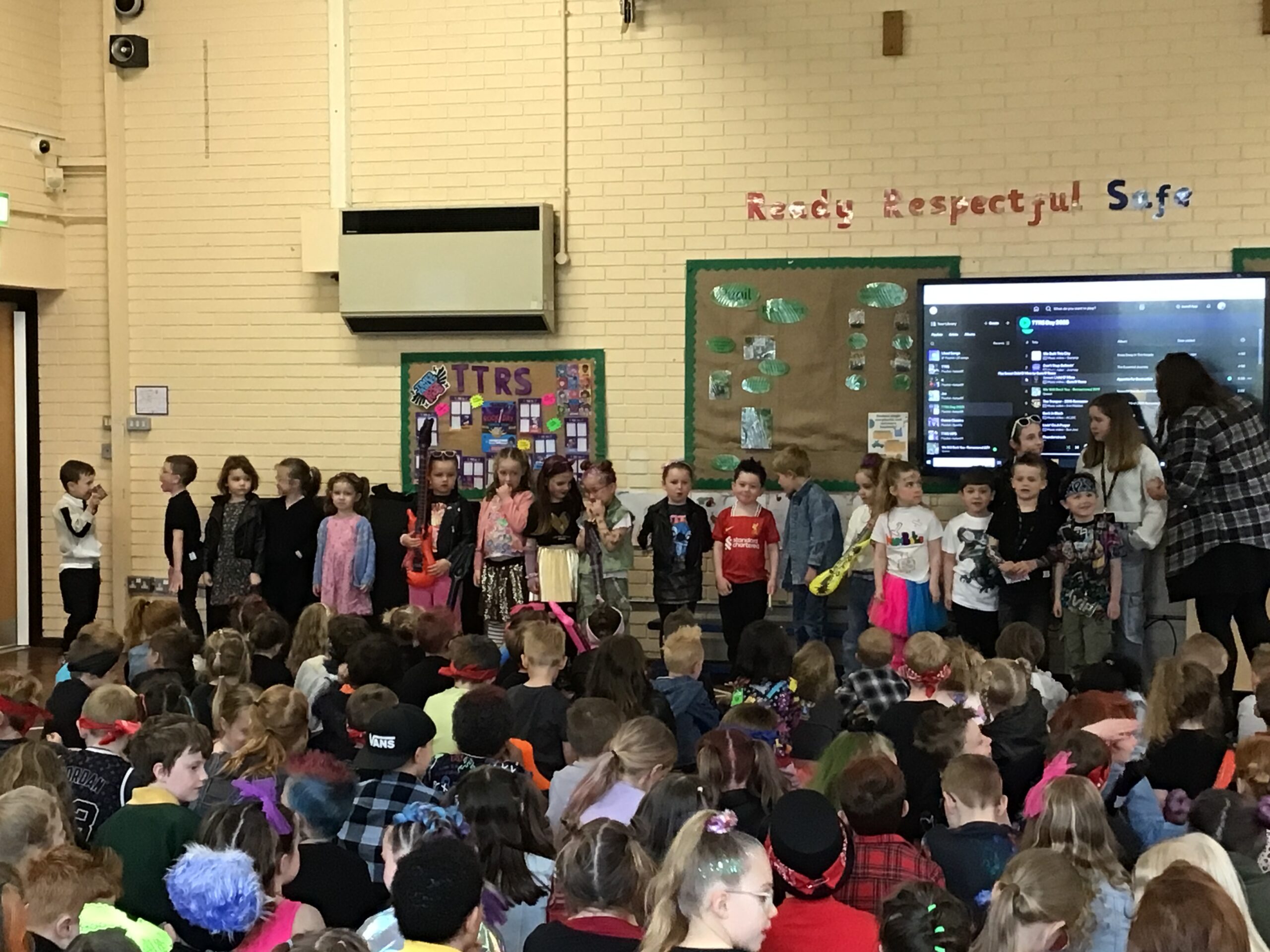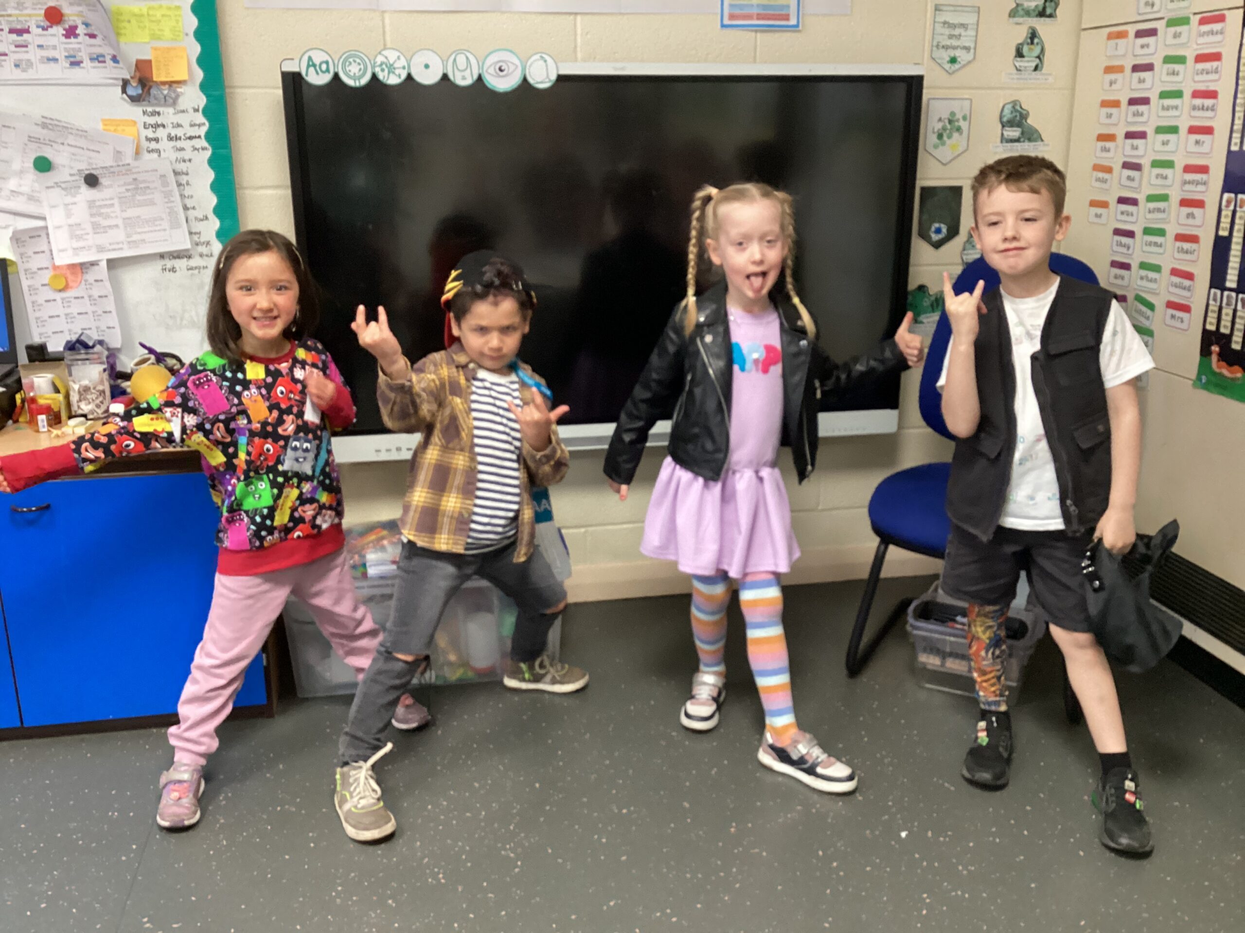On Monday 31st March 2025 we held a Times Tables Rock Stars Day. – children in KS2 were dressed up as rock stars and KS1/Reception children as numbers/robots. See below pictures from the TTR day.